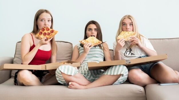 幸せな友人やピザを食べて 自宅で映画やテレビ シリーズを見ている 10 代の少女 の写真素材 画像素材 image 51808786
