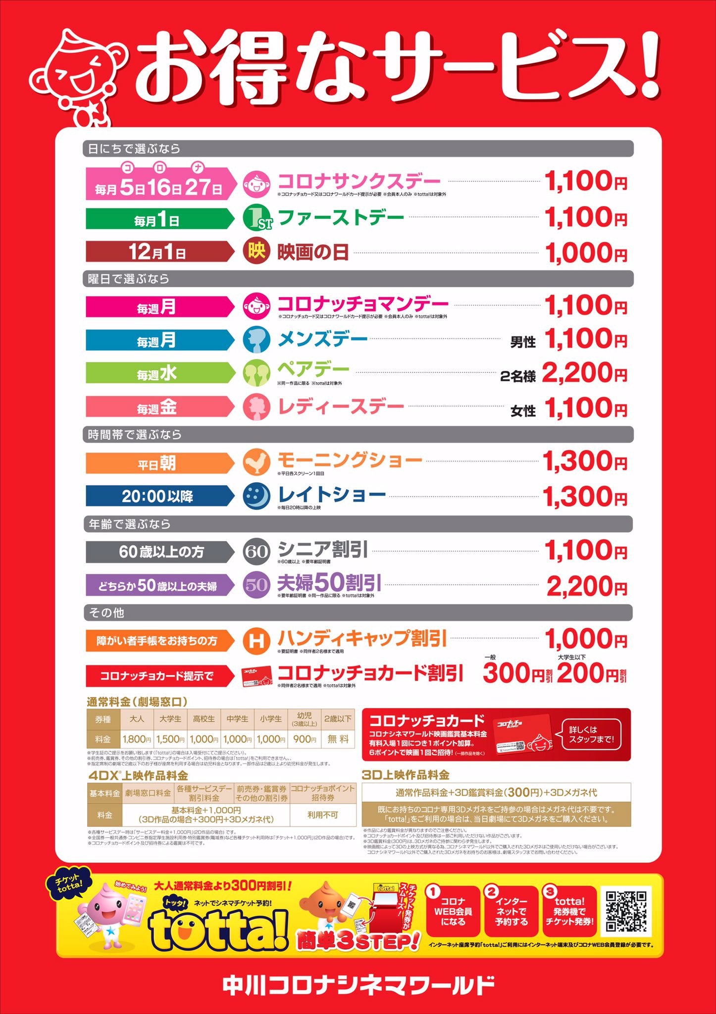 中川コロナシネマワールド 公式 auf twitter 中川コロナのサービスデー 皆様ご存知ですか 毎週月曜日は メンズデー 男性のお客様は1 100円でご鑑賞頂けます 女性の方もコロナッチョカードをお持ちでしたら 1 100円でご鑑賞頂ける コロナッチョ