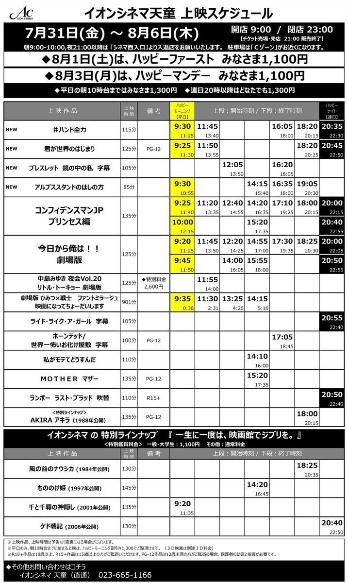 uzivatel イオンシネマ天童 na twitteru お待たせいたしました 7 31 金 8 6 木 の上映時間です 1日 土 はハッピーファーストで皆様1100円です