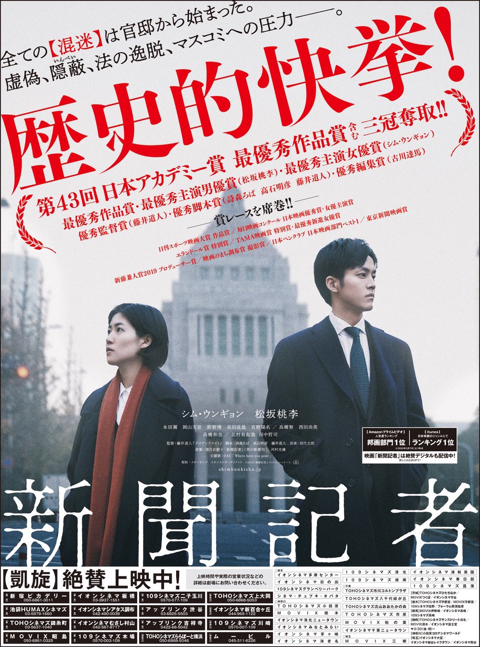 映画 新聞記者 on twitter 凱旋上映中 新聞記者 日本アカデミー賞 最優秀男優賞 松坂桃李 と最優秀女優賞 シム ウンギョン のw受賞は 悪人 妻夫木聡 深津絵里 以来 最優秀作品賞も加えると たそがれ清兵衛 真田広之 宮沢りえ 以来 17