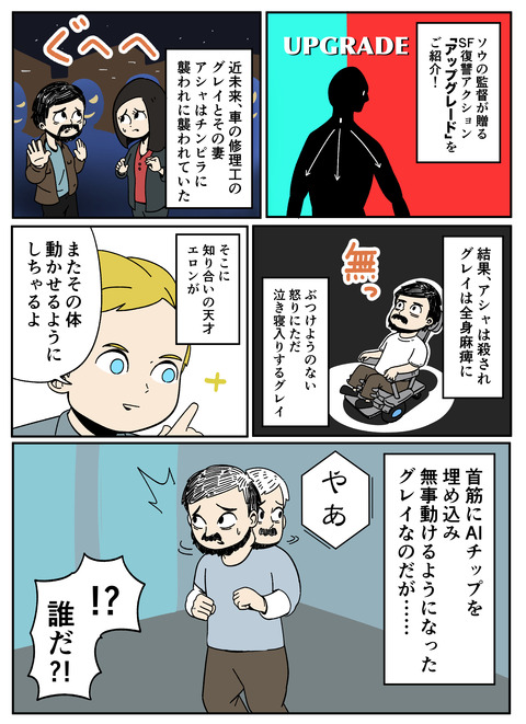 映画 アップグレード 公式 pa twitter 著名人コメント続々到着 漫画 aiの遺電子 作者の 山田胡瓜 kyuukanbaさんからアクションシーン絶賛のコメントいただきました aiに寄生された人間ならではの戦闘シーンが面白いです コメントページは