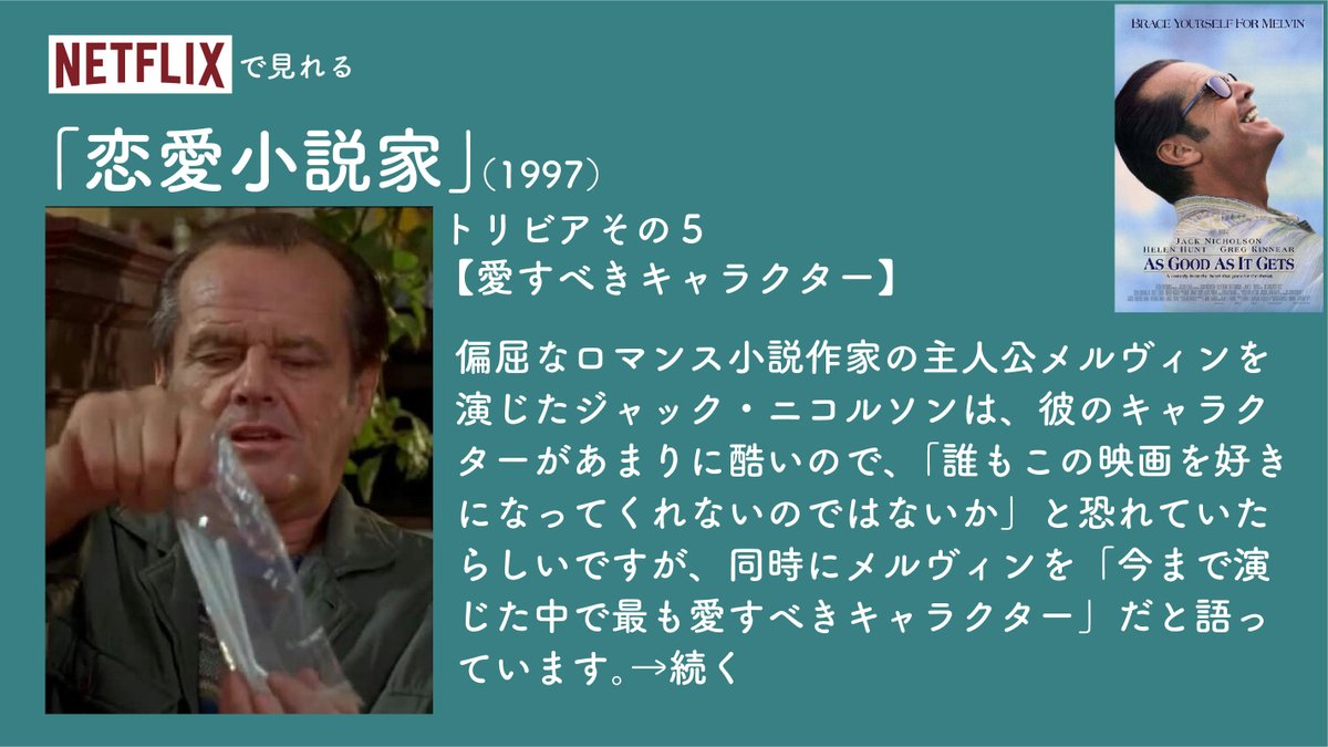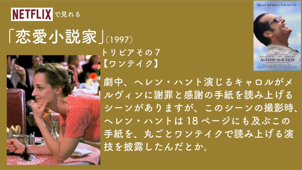 毎日映画トリビア 日曜夜9時からyoutubeでファルコン ウィンターソルジャーのトリビア配信 on twitter 1日1本映画トリビア生活95日目 恋愛小説家 1997 偏屈なロマンス小説作家と彼の行きつけのレストランで働くウェイトレスとの恋愛を描いた恋愛ドラマ 監督