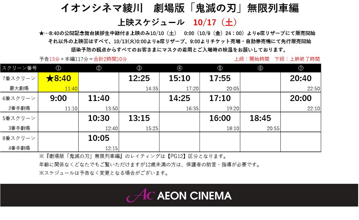 イオンシネマ綾川 on twitter 鬼滅の刃 10 16 金 22 木 先行販売分の上映スケジュール です チケットは10 13 火 0 00 e席リザーブ 9 00 劇場窓口にて販売開始 尚 10 17 土 8 40の回 中継付上映 は10 10 土 0 00 e席リザーブ 9 00 劇場窓口にて販売