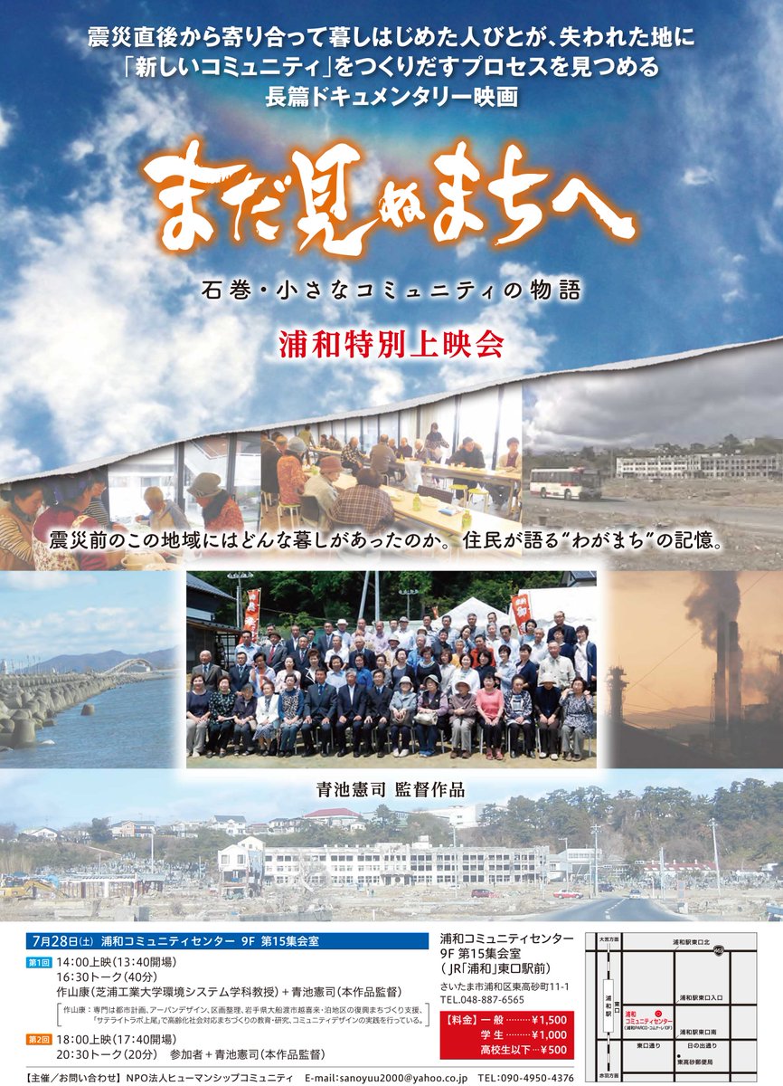 野田北部を記録する会公式 a twitter 上映情報 7月 埼玉 浦和 映画 まだ見ぬまちへ 石巻 小さなコミュニティの物語 7 28 土 14時 18時 各回上映後トーク 浦和コミュニティセンター 9f 第15集会室 jr 浦和駅東口下車 一 般 1500 学割あり 主催 npo