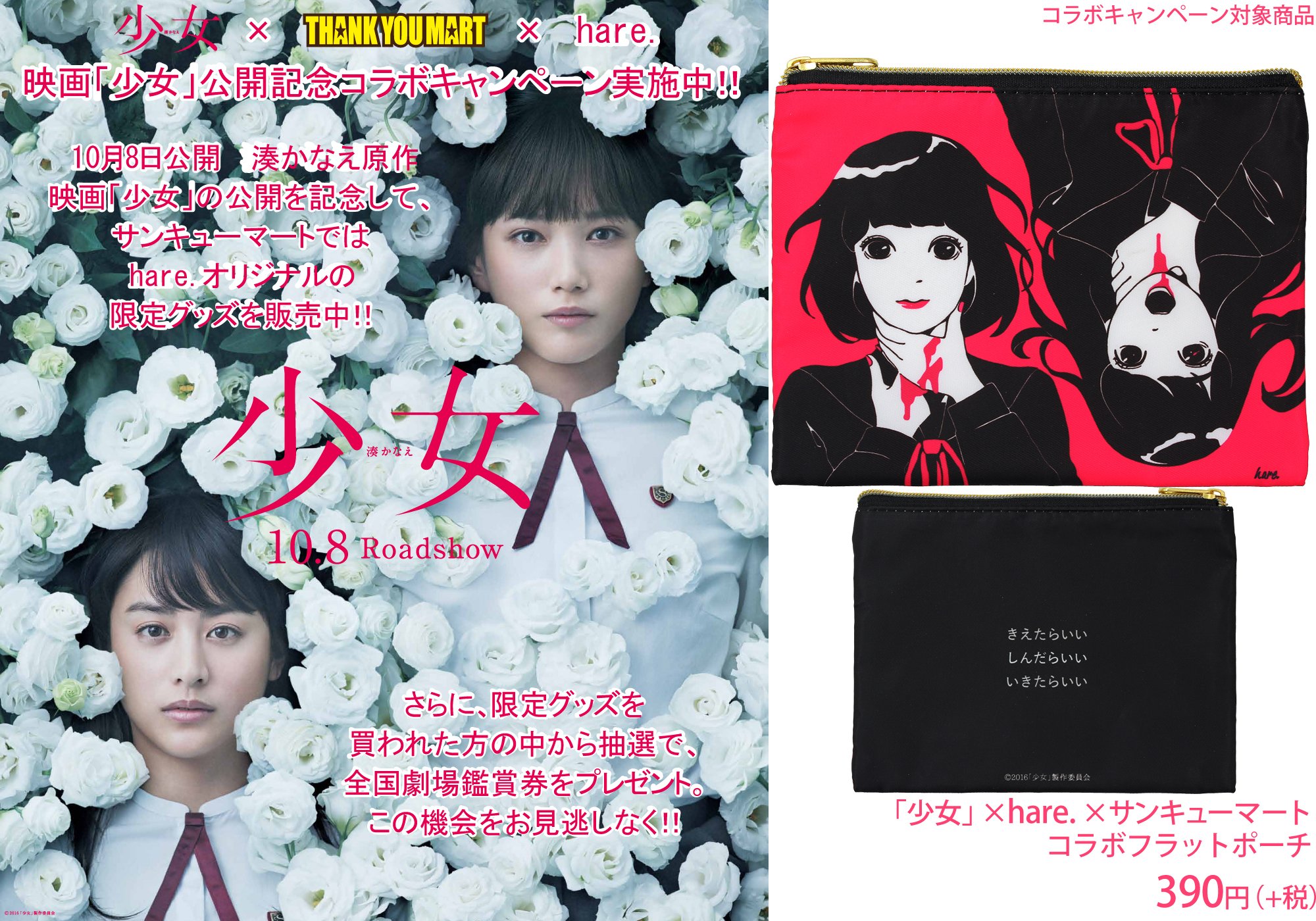 サンキューマート 公式 twitterren 10月8日公開湊かなえ原作 本田翼 山本美月 映画 少女 hare サンキューマートコラボキャンペーン 対象商品 コラボクリアファイルセット ご購入の上 抽選で劇場鑑賞券が当たる サンキューマート各店で もちろん全品