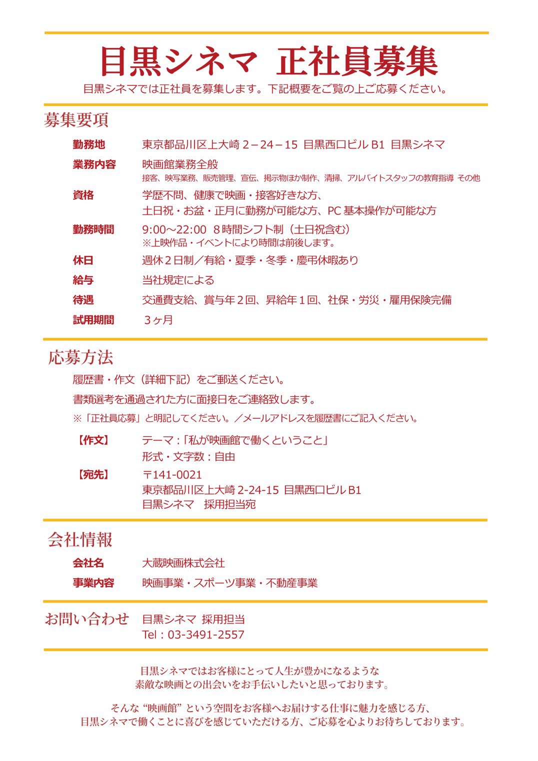 目黒シネマ on twitter 正社員 アルバイト募集 ただいま目黒シネマでは映画館で働いてくれる 正社員 と アルバイト を募集しております 画像で情報をご確認の上 ご応募ください よろしくお願いいたします 目黒シネマ 正社員募集 アルバイト募集